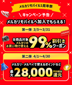 2026年3月5日よりメルカリモバイル1周年記念キャンペーンを実施中です。3月31日までは99%割引クーポン、第二弾(4月1日〜4月30日)ではメルカリ・メルペイで使えるポイントを最大28,000円相当還元が適用されます。