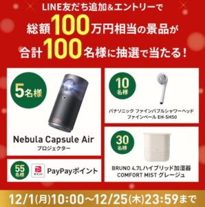 | 抽選で100名に当たる豪華景品 | Nebula Capsule Air:5名 パナソニック ファインバブルシャワーヘッド ファインベール EH-SH50:10名 BRUNO 4.7L ハイブリッド加湿器 COMFORT MIST グレージュ:30名 990円相当のPayPayポイントプレゼント:55名 | ① LINEMO公式LINEアカウントを友だち登録 ② 該当ページのエントリーフォームから2025年12月15日までにエントリー |