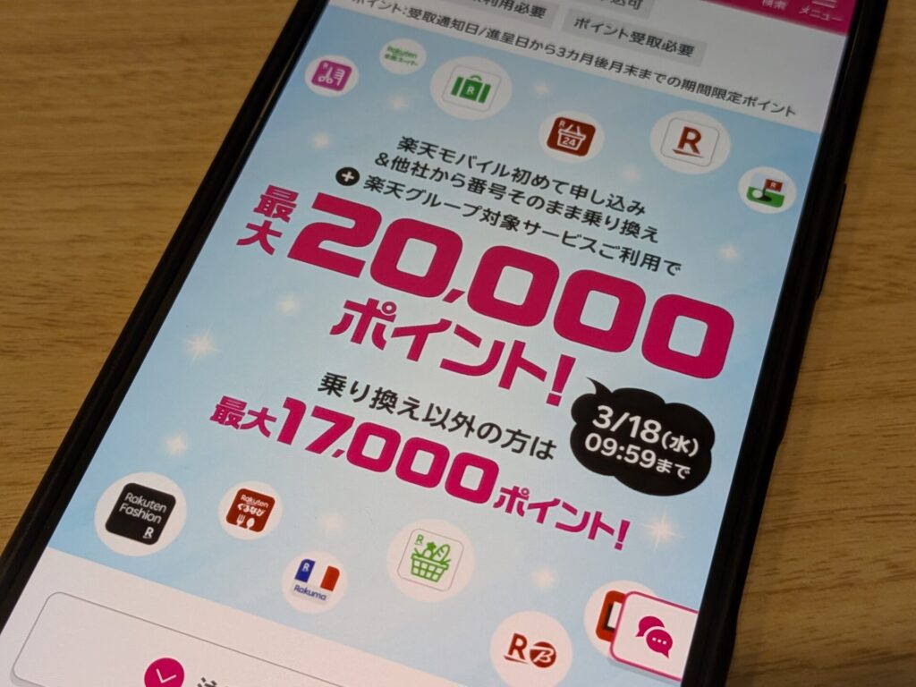 ![]() ![]() 【3/18まで限定】 | ・他社から乗り換えで最大20,000pt ・乗り換え以外なら最大17,000pt ※対象サービス1以上の利用 | 楽天モバイル初めてお申し込みで最大20,000ポイント進呈キャンペーン |