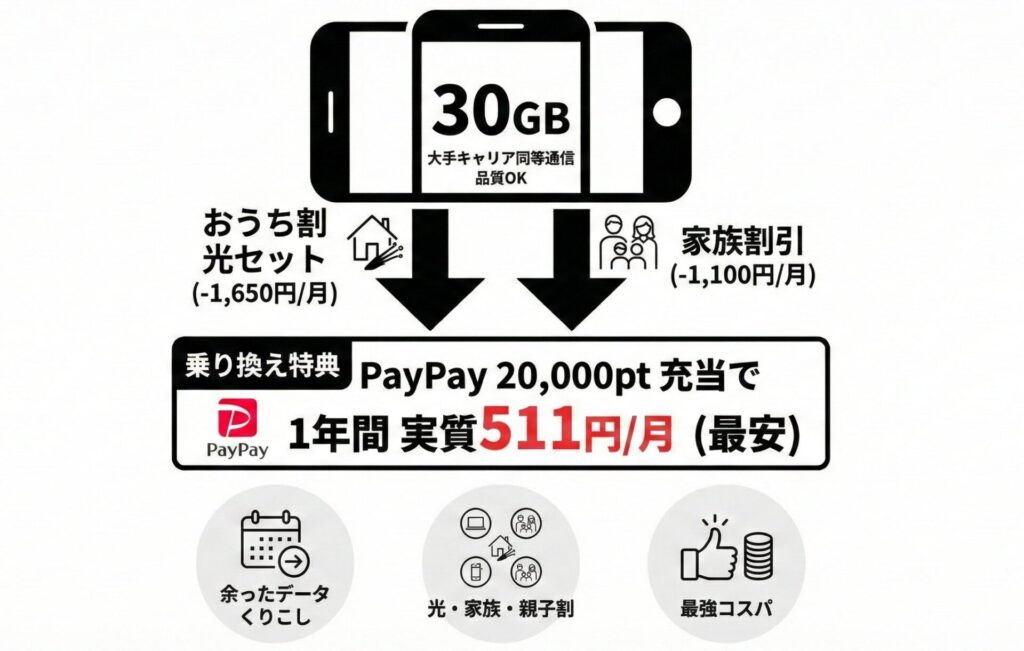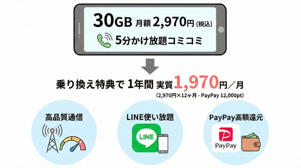 通信品質が良く、5分かけ放題もコミコミ。LINEデータフリーでビデオ通話でもデータ消費なし。PayPayキャンペーンも高額で実質の安さへ貢献
