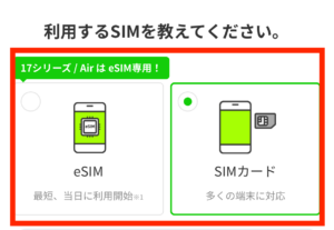 この画面解説では「SIMカード」を選択していますが、もしもeSIMで発行したい場合はeSIMを選んでください。