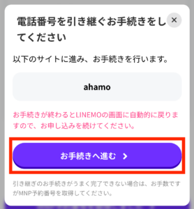 この手続きをすることでahamoからLINEMOへ完全に回線が切り替わるため、このまま手続きしてよいか確認しましょう。