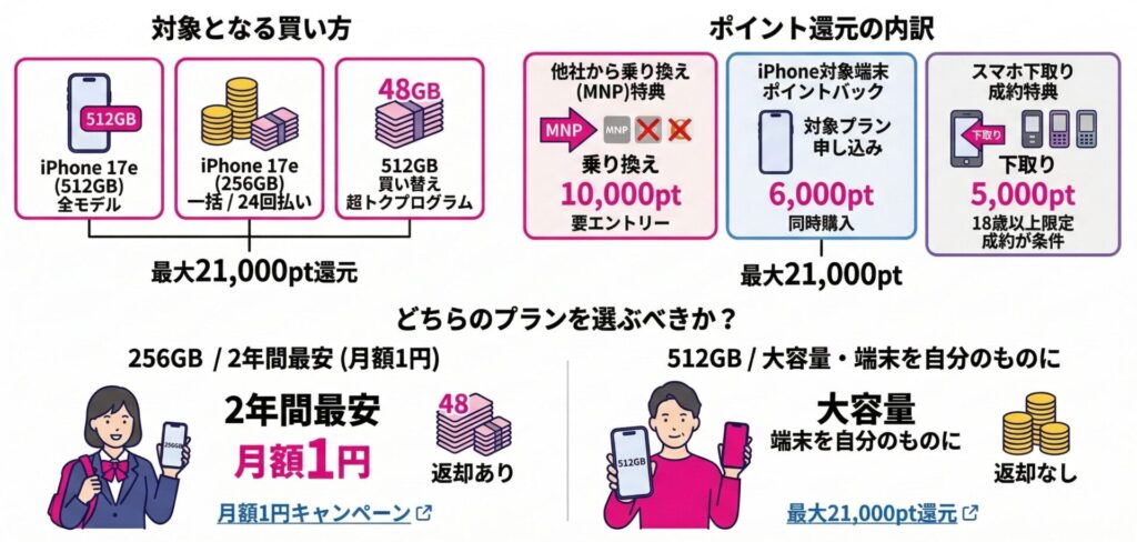 iPhone 17e(512GB)や一括購入で最大21,000ポイントを受け取る方法