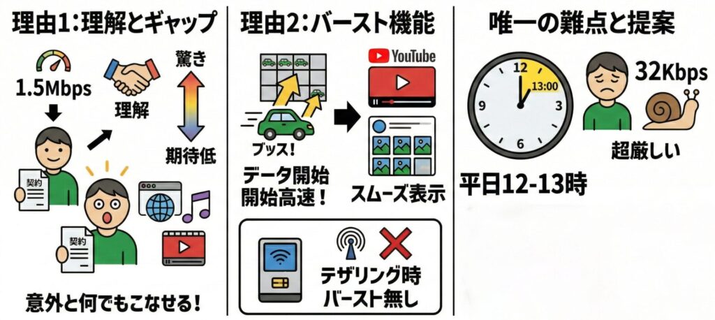 初速のバーストモードがあるので実際に200Kbpsでもそこまで、テキスト重視のSNS等であれば比較的ストレスは感じにくい速度になっています。