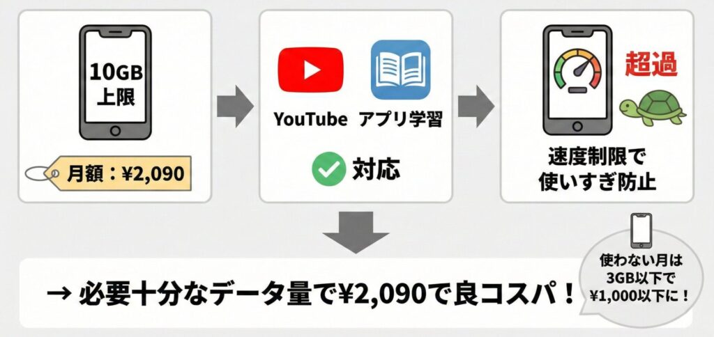 ② 通信制限の安心感|10GB使っても月額2,090円で打ち止め
