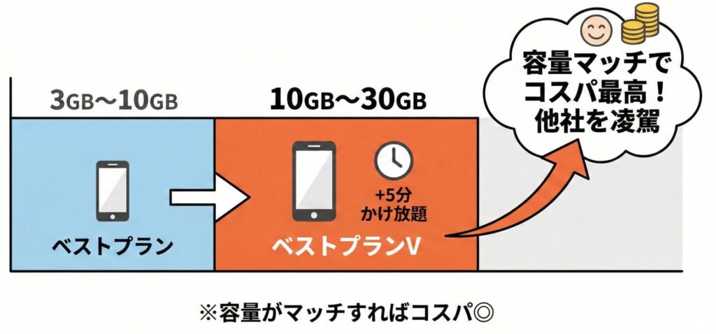 | ベストプランV | ~30GB | 2,970円 | 5分以内無料(標準付帯) | 中容量+通話が多い人向け、定額で安心 |