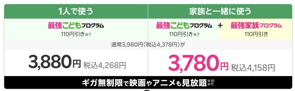 また子供がもしも12歳以下であれば、最強こどもプログラムを適用できるので、通常3GB以下なら1,078円→528円(家族割含む)で利用できる月々のコストを抑えられます。→最強こどもプログラムについて