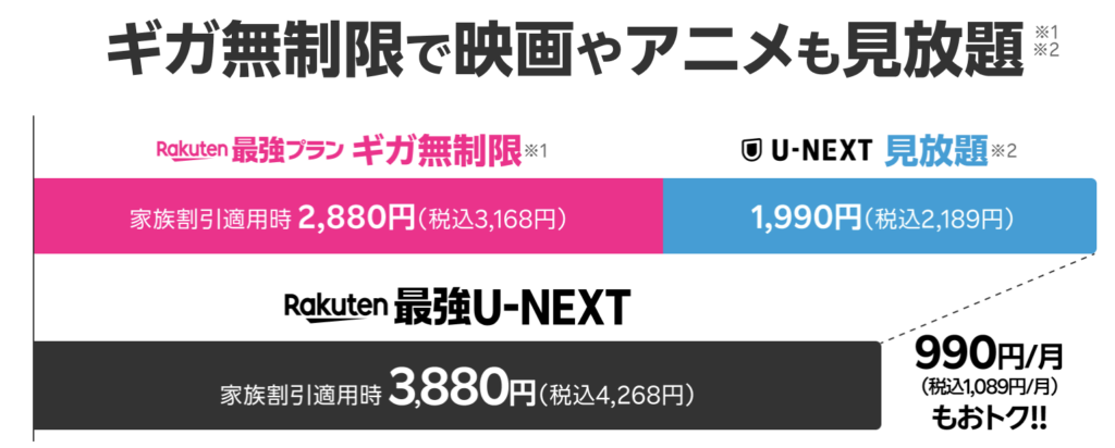Rakuten最強U-NEXTは楽天モバイルの「無制限のデータ通信」とU-NEXTの「見放題サービス」合計で月額4,268円(家族割-110円適用時)で使えるハイコスパな見放題・データ使い放題プランです。